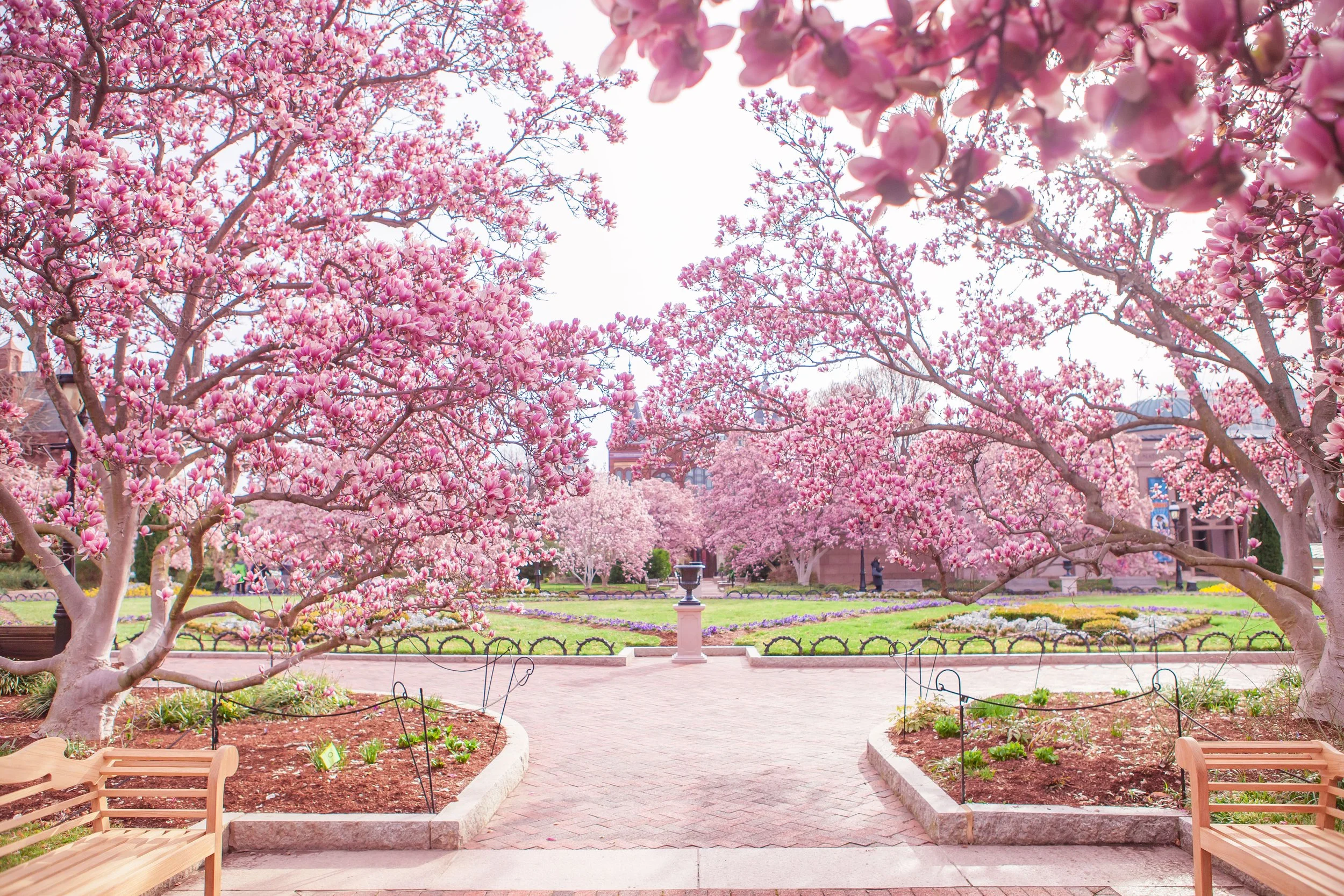 Enid A. Haupt Garden in late March, magnolias in bloom